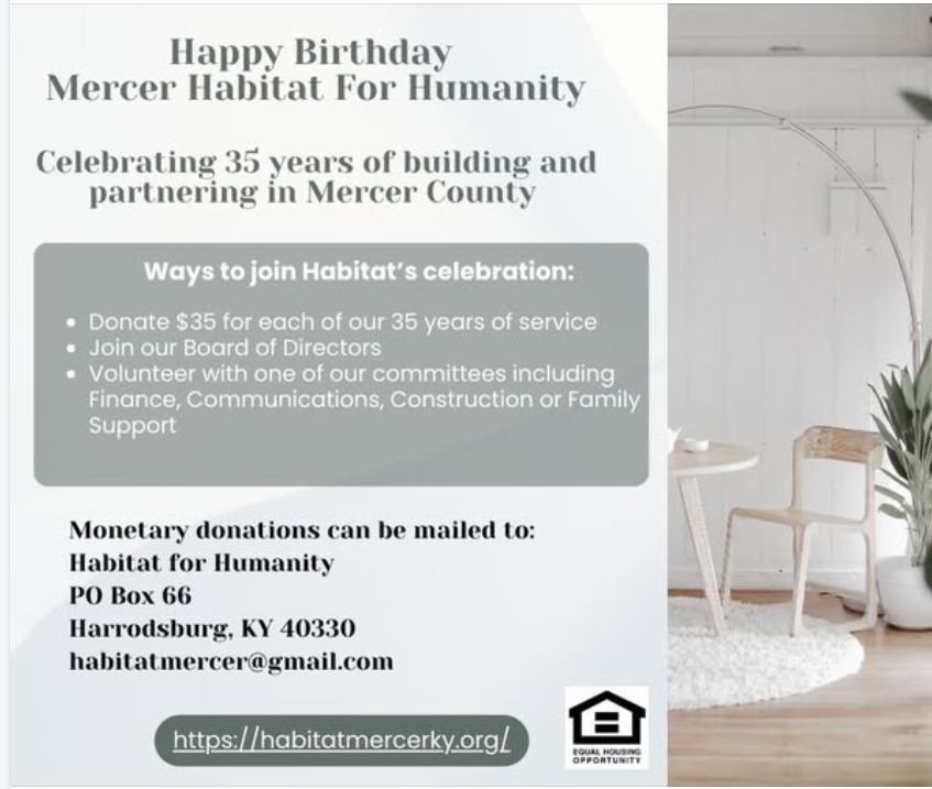 Monetary donations can be mailed to:Habitat for Humanity P.O. Box 66Harrodsburg, KY 40330