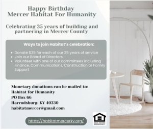 Habitat for Humanity-Mercer County (HFHMC) Mission: HFHMC works in partnership with God and people everywhere, from all walks of life, to put our faith in action by building affordable, quality houses with families in need to eliminate poverty housing, one family at a time. We will be counting on your love and generosity to complete this task that the Lord has put before us. Partner Family Applications are taken periodically, on an irregular schedule, when Habitat can accommodate a new Partner. Application Meetings are held at a public meeting room and will be announced on this website at least 3 weeks in advance. Application Meetings are also announced on WHBN and WDFB radio, in The Harrodsburg Herald, and on public bulletin boards in the area.